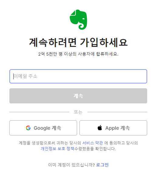 - 기존 계정 로그인: 에버노트 계정이 이미 있다면 이메일과 비밀번호를 입력하여 로그인합니다.